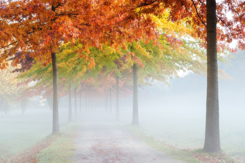 Im Herbst ist es aber eine andere Allee, die richtig auftrumpfen kann. Große Sumpfeichen säumen den Weg, der sich neben der Feuchtwiese von der Wandelhalle in Richtung Bad Brückenau befindet. Die nordamerikanischen Schönheiten haben an dieser Stelle den perfekten Standort, da sie mit ihrem Wurzelwerk den Fußweg stabilisieren und kein Problem mit feuchten Böden haben. Im Herbst bestechen sie mit einer eindrucksvollen Herbstfärbung. Hier entdeckt man verschiedene Farbnuancen. Von leuchtenden gelb-orange Tönen, von Scharlachrot bis zu einem dunklen Karmesinrot. Besonders schön wirkt das Farbspiel, wenn zarte Nebelschwaden die ausdrucksstarken Solitärbäume umspielen und die Herbstfarben noch stärker zum Leuchten bringen.
