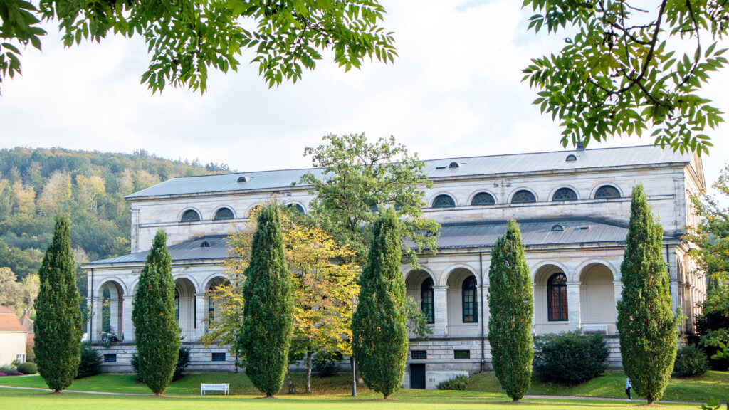 Vermutlich waren das damals Säulenpappeln, die mit 50 – 80 cm pro Jahr zu den schnellwachsenden Bäumen gehören. Leider hat der viel zu schnelle und starke Wuchs auch seine Nachteile, denn bereits ab einem Alter von 40 Jahren kommt es bei der Pyramiden- bzw. Säulenpappel zu Astbrüchen und auftretender Stammfäule. Somit wurde bei der Freistellung des Kursaals nach geeigneteren und erhabenen Alternativbäumen gesucht. Eigentlich fast schon naheliegend, dass man sich hier für Eichen entschieden hat, denn auch dieser Baum zählte zu Ludwigs „Lieblingsbäumen“. Säulenförmig in den Himmel ragend, wie Zypressen. Passend zur Architektur wurden im Schlosspark Säuleneichen gepflanzt. Gerade zum klassizistischen Kursaalgebäude mit seinem tempelartigen Aufbau und den hohen Arkaden bilden die symmetrisch aufgepflanzten Säuleneichen einen erhabenen und angemessenen Rahmen. Zudem behält die langsam und säulenförmig wachsende Stieleiche ihr Laub bis in den Februar hinein. Erst mit dem beginnenden Neuaustrieb verliert sie ihr altes Blätterkleid. Im Herbst leuchten die ledrigen Blätter gelb bis gelbbraun. Selbst König Ludwig der I. sollte sich bei diesem Anblick auf den Kursaal an die Antike oder das schöne Italien erinnert fühlen.