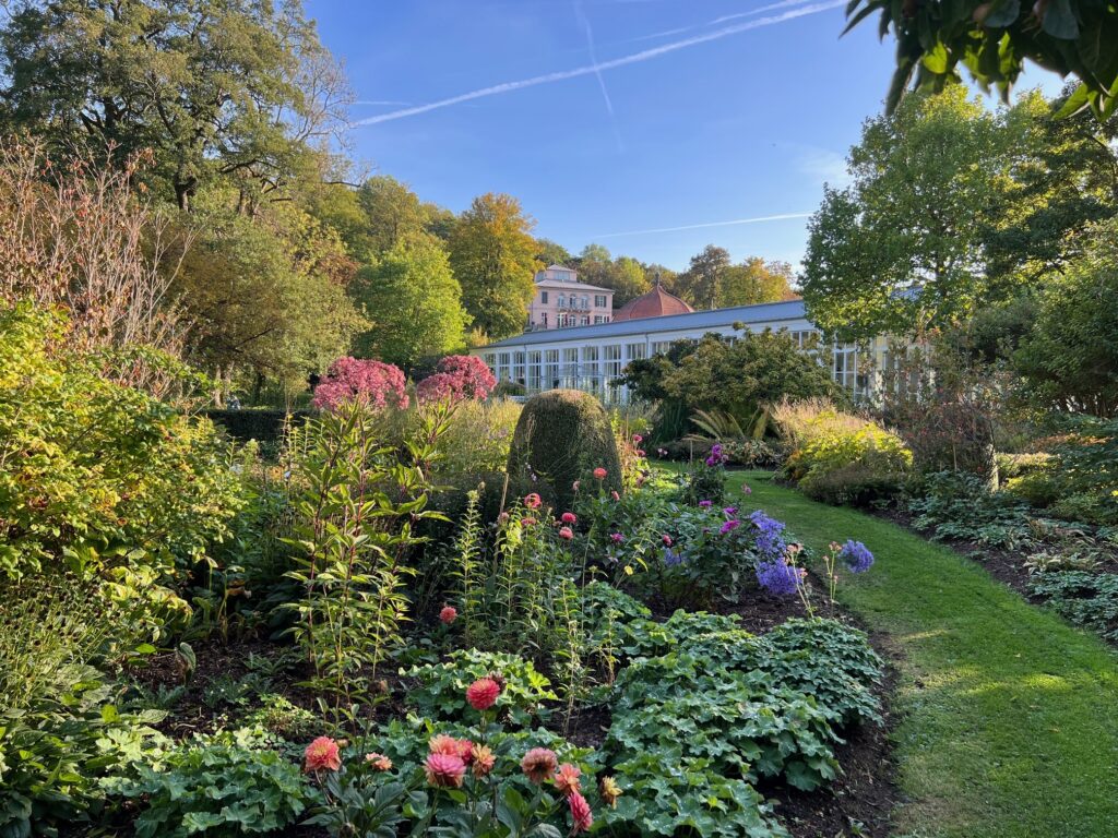 To the east of the Wandelhalle is the Wandelgarten. Our changing garden is the gateway to the open landscape and consists of a central lawn parterre, a planted sunken garden with a water feature and a large perennial and hydrangea bed. Here there is a transition from the baroque palace park into the English-style landscape park.