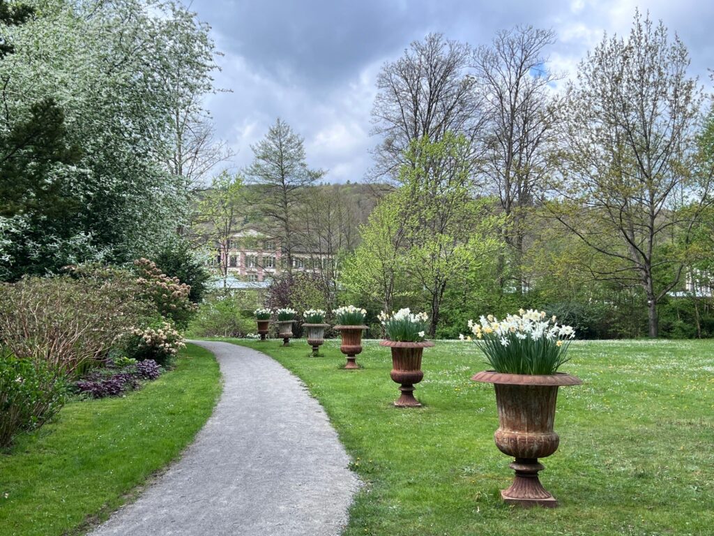 The hydrangea bed was also created in 2014. A wide variety of types of hydrangeas grow here on over 200 m². Protected and in the shade of the fragrant bird cherry, the hydrangeas grow into large bushes. Due to the humus and lime-poor soil as well as the high humidity, the Asian beauties have found the right location in the state spa. One of the well-known planted hydrangeas is the blue-flowering farmer’s hydrangea (Hydrangea macrophylla), which only retains its blue flower color when the pH value is low and trace elements are present in the soil. But also other hydrangea species such as the panicle hydrangea Hydrangea paniculata, which can reach a height of up to 4 m. The creamy white, cone-shaped flower spikes turn a pale pink as they fade. Even in the winter months, the golden-brown dried flowers decorate the bed. The velvet hydrangea Hydrangea aspera subsp is one of the rarely planted hydrangeas. sargentiana and the oakleaf hydrangea Hydrangea quercifolia. The velvet hydrangea impresses with its dull green leaves and two-tone flower plates. The 10 to 25 cm long white flower panicles open between July and August and then fade to pink. The autumn color of the oak leaf hydrangea is particularly beautiful. Their leaves then glow from orange to red to reddish brown.